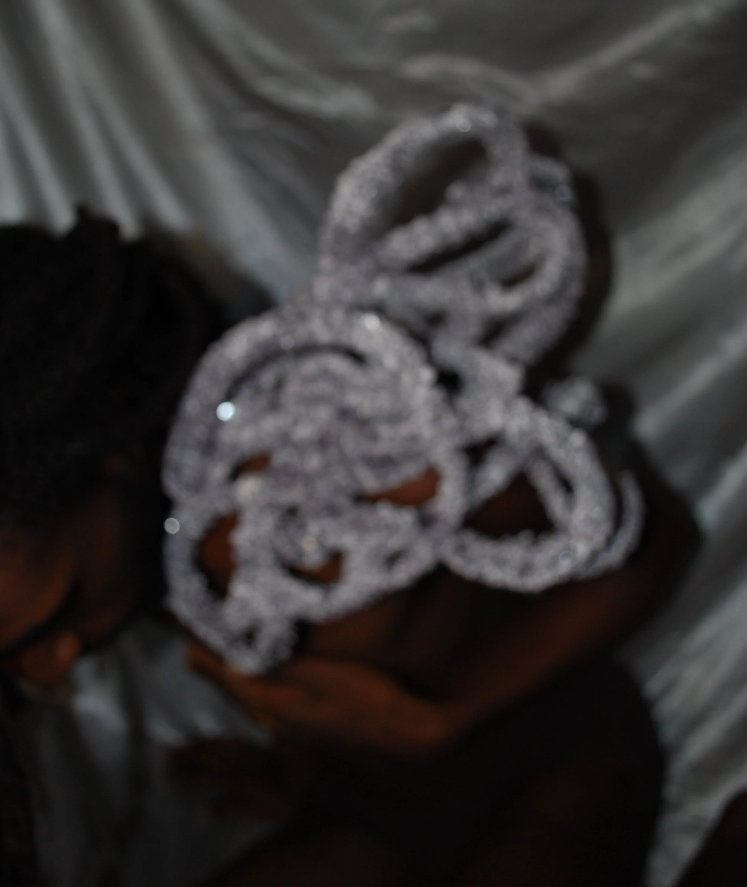 Calcify is an exploration into wearable sculpture and my conceptualizing of “body extensions.” I am captivated by how people present themselves and the mechanisms they use to protect. endear themselves to, or understand themselves and the the spaces they inhabit. Through experimenting with resin and grown crystals over organic material, I seek to uncover how performative elements of society ossify into the persona. This concept is heavily linked to my BFA thesis and accompanying work “Fruits of My Labor,” (2024) in materials, yet more closely projected through the lens of body sanctity.
